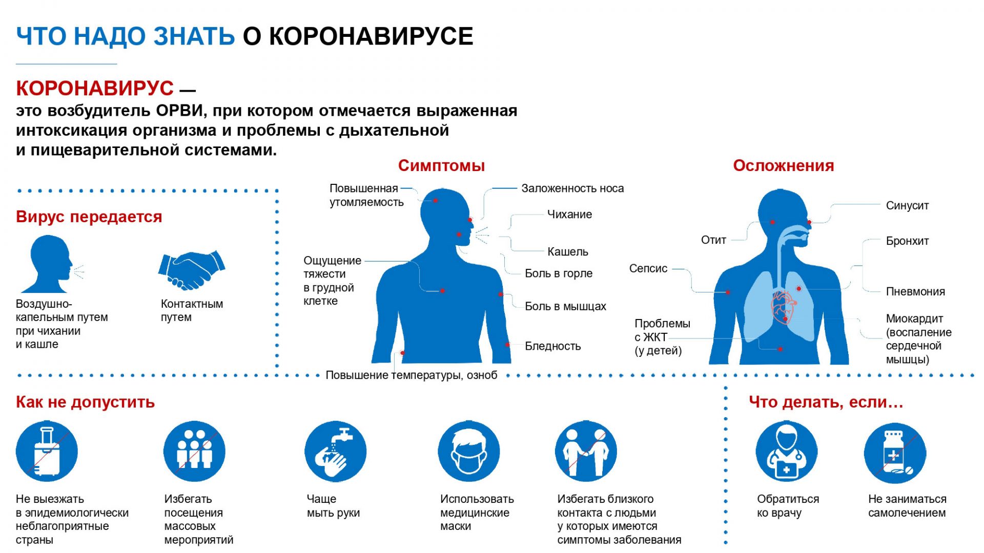 Коронавирусная инфекция — это группа острых инфекционных заболеваний, вызываемых различными серотипами коронавирусов. Характеризуется синдромом общей инфекционной интоксикации и синдромом поражения респираторного тракта, в основном верхних и средних его отделов — носа, глотки, гортани, трахеи и бронхов. При некоторых вариантах вируса, таких как MERS-CoV, SARS-CoV, SARS-CoV-2, в 20 % случаев развивается тяжёлый острый респираторный синдром с высокой летальностью